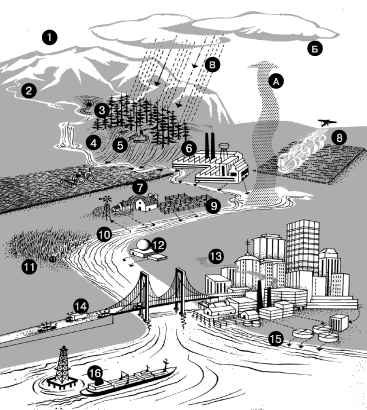 Три важных стадии круговорота воды: испарение (А), конденсация (Б) и атмосферные осадки (В). Если в него вовлечено слишком много природных или искусственных загрязняющих веществ из перечисленных ниже источников, естественная система не справляется с очисткой воды.