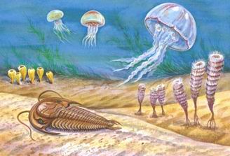 кембрии еще не было, но уже жили кишечнополостные, губки, ныне вымершие археоциаты, плоские